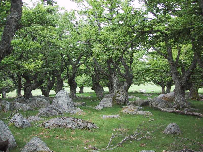We continued on a dirt road with solid yellow broom on the rise ahead of us and a cuckoo singing to us from the woods on our right. This led to piney woods where there was lovely bird song and we tried to locate the warblers, but though they were right next to us we could not find them. As we approached a rise with large gnarled old beech trees, the cowboys that we had seen at Pont du Tarn overtook us, most of them mounted but three at the end leading their horses. They were fully equipped with chaps and cowboy hats and certainly looked the role.
