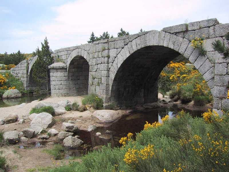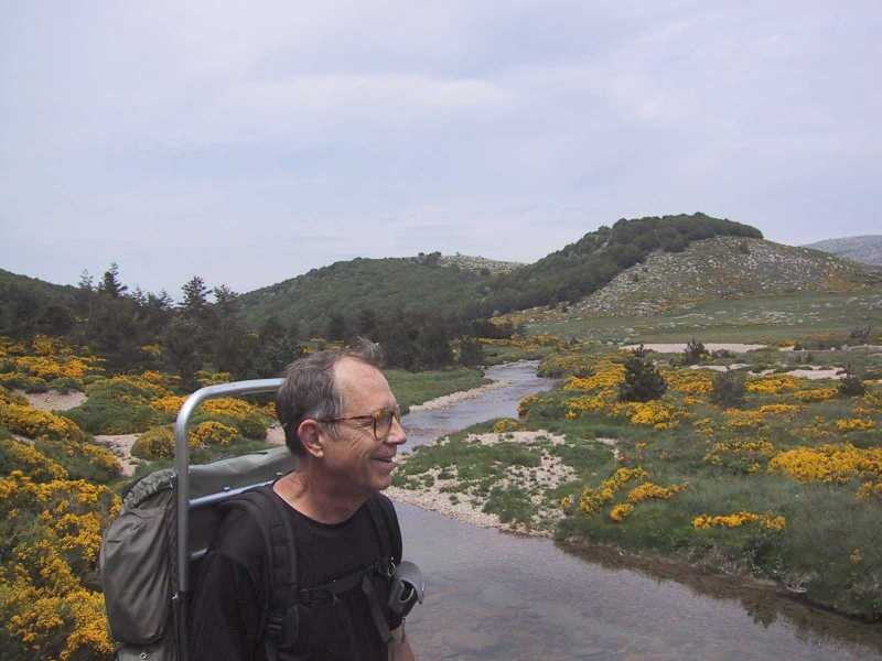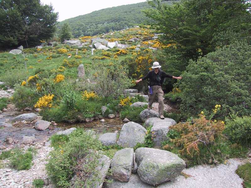 At the point the road turned north towards l'Hospital, the trail left the road and followed an old road from the 18th century also used by the Hospitalars of St-Jeane-de-Jerusalem. It was cobbled and shady and ran along a rushing stream. The path divided between one running north to l'Hospital and ours which turned south over the stream. There were large stones 3 feet deep by 2 feet square on the top positioned in three separate streams which enabled passage across the crystal stream. The grassy trail rose above the river where there were several waterfalls before a dam. Beyond this our path leveled out and the stream was 10 or 20 yards wide and completely clear. The meadows were gently rolling with rocky hills beyond.