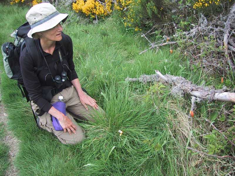 We continued along what was now a small river and as we approached the Pont du Tarn, the vegetation changed to pine forest. Here eight to ten men on horseback were picnicking; their horses tethered near the path. The Pont du Tarn, a very old structure, was gray stone with three graceful arches. Our trail did not cross it and we continued on through some woods. As we came out of the woods there were narcissi at their peak, but then as we passed a herd of Holstein cattle, Bon spotted the yellow and orange wild tulip of which she had read and was thrilled to find. There were more along the trail further on.