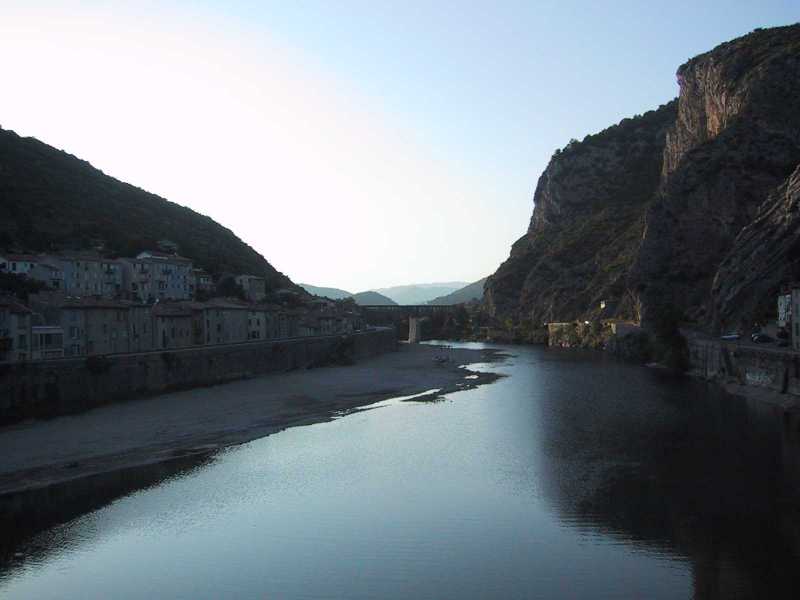 We were now about 2 kilometers from Anduze, walking along a busy route looking at the white cliffs above with the evening sun striking them. We passed under a bridge at the north of town and could see the bridge into Anduze. Families were swimming in the evening - it was about 8:15 p.m. We crossed the bridge into a busy town where a crowd had gathered to award prizes to runners who had competed in a race. We had walked 24.5 miles and felt we deserved a prize too!