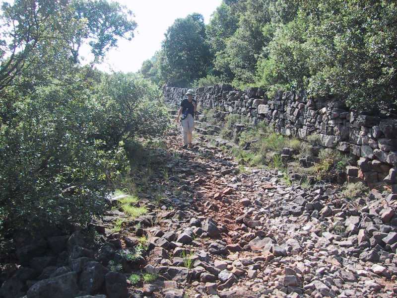We continued on a woods road with occasional vistas back up at our luncheon spot and then came to a junction in the road where our route crossed a ridge. We now looked out onto a different valley to the south with a craggy cliff to our left and a precipitous drop in the trail. We could shorten the trail by jumping but opted for the slower descent through steep switchbacks where the road was cemented to channel the water. The road continued along the mountain and we looked for critical juncture for us to continue on GR 67. It was poorly marked and but we found the trail further on where it left the road mounting sharply through schist to our right. The next two kilometers was very hard going climbing on schist and descending on a very dry hillside with heather. The schist rose vertically and the footing was very difficult for now weary hikers. At one point we lost the trail but Bon found where it descended on loose schist for a stretch until it reached the woods. It passed a totem pole and then it bordered a small dammed pond (mud hole) where we saw an unusual conifer looking bush with bright red flowers. Suddenly, the trail was nowhere to be found but we continued on and soon rejoined it. We descended to the road over rock which appeared to be a draille but with a steep drop and then a narrow grassy way between stone walls into a sparsely populated area above the upper part of Mialet.