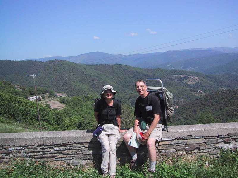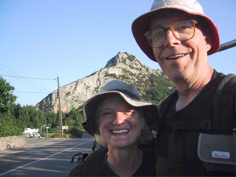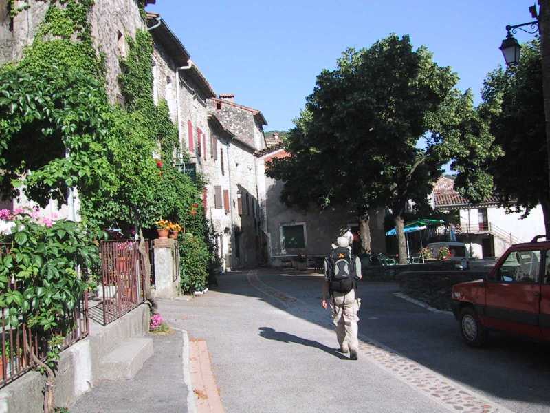 After crossing a bridge we again lost the trail. Signs in both directions were crossed out indicating these were not the trail but we could not determine where it went. I reconnoitered up a hill while Bon found the trail which turned down just at the edge of the bridge. This mounted a wonderful grassy draille which passed some buildings where everything was mowed except the trail (perhaps a protest at having it pass too close to the houses). It became a stony walk by some buildings and under an arch (at L'Eliziere) we passed two gentlemen who confirmed we were on GR 67. It continued on through another area with stone walls that wasn't mowed and then it hit a long stretch of old draille where the stone of the path was just rubble. This followed the side of Mont Camp and was called Malboissiere. It was very tough walking and hurt the feet. Occasionally there would be flat rocks but mostly it was rubble. I could not help, however, being amazed at the engineering of the trail which on one side for over two miles was stone wall and must have had cobbled stones in an earlier time.