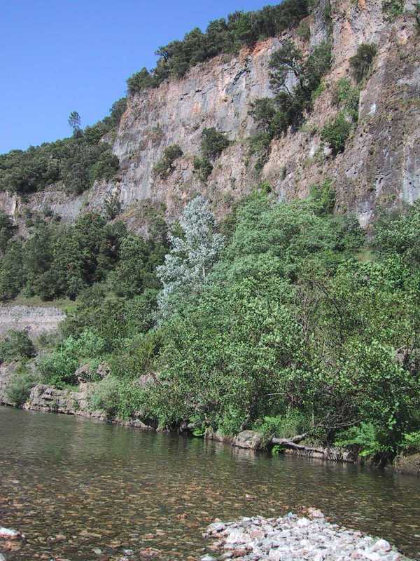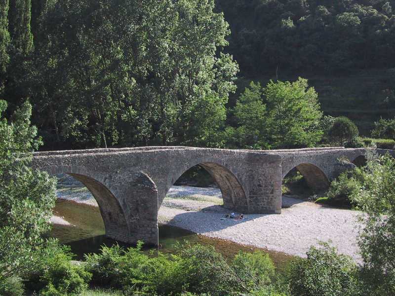 After our swim we walked along the busy road passing a bend in the river which led to the Pont des Camisards an arched stone bridge from the early 18th century. Then we walked up through the town of Mialet which had a square with sycamores and was generally a well kept, prosperous village. As we left, we passed below their war monument and followed the main road. Then I found a stairway down to the river walk which was grassy, away from the traffic with pleasant views of gardens, fields, and stone buildings across the river. Soon the trail mounted away from the river along some small streets where it joined the main road.