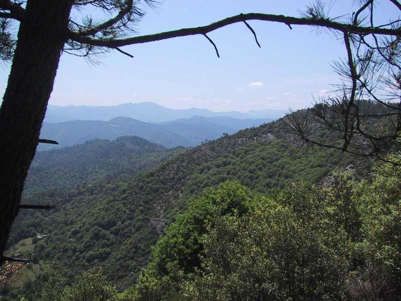 At the top we continued on route D13 a slightly rising road (and past a turnoff to les Ayres) until it intersected the GR 67. Here the trail mounted steeply in the woods and then it again joined the road descending for a while. Then it again climbed, mounting a trail of shist that seemed to be freshly bulldozed. We climbed the Montaigne de la Vielle Morte with some vistas off to our right.. It was now warm but as we got higher mountain breezes cooled us. At the top we crossed the GR 44 about 1:30 p.m. and decided to stop at a rocky lookout over the valley, left of where we would be headed. It was a precipitous lookout with warm sunshine.