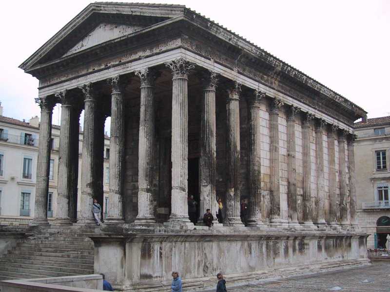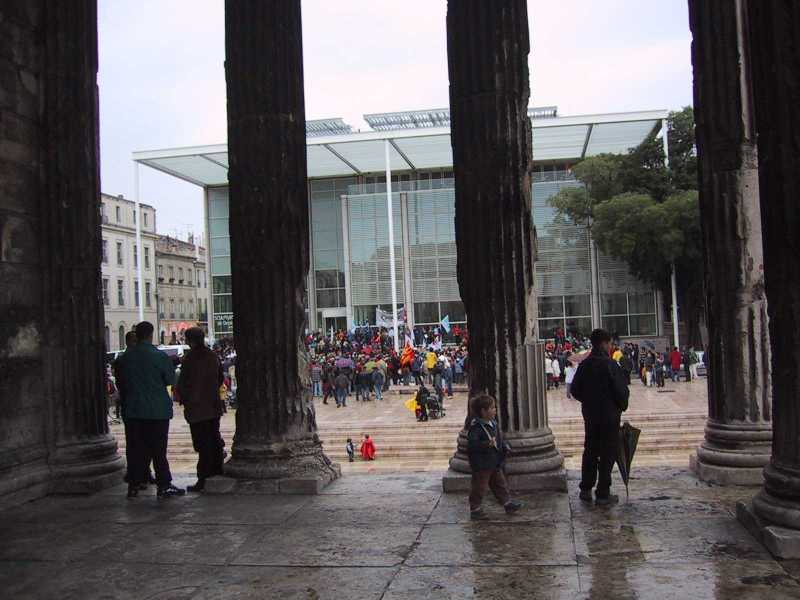 The train was comfortable and fast, traveling the roughly 400 kilometers to Nîmes in about 4 hours with a couple of stops. We arrived about 5:00 p.m. I donned my new Rob-given rain gear - there was a heavy drizzle coming down. We walked up to the arene a Roman amphitheater where we given directions to the Touriste Bureau. We walked there arriving first at the extraordinary Maison Carrée where there was a labor demonstration underway - thankfully our train had not been included in the strike.