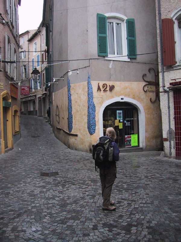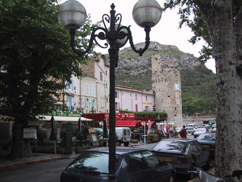 Anduze was a small town with a Sycamore-lined main street leading down to the river. At the Office de Tourisme, next to the bus stop, there were several women who were very helpful on hotels and plans for the next day. We decided to try the gite detap, a hostel, which opened at 5:00 p.m. This left time for a stroll down by the river which was dominated by a hill to the southwest with slanted layers of pale rock between the greenery. It still was drizzling as we walked back around the town and to the gite. We were given a lovely room with private bath (and three extra bunks for any friends we might make). The father and son, Sebastian, who ran the gite gave us a number of recommendations on our planned itinerary over the next few days and were extremely friendly and helpful. They also told us about the flood in Anduze the prior year which had filled about two thirds of the bottom story of the gite.