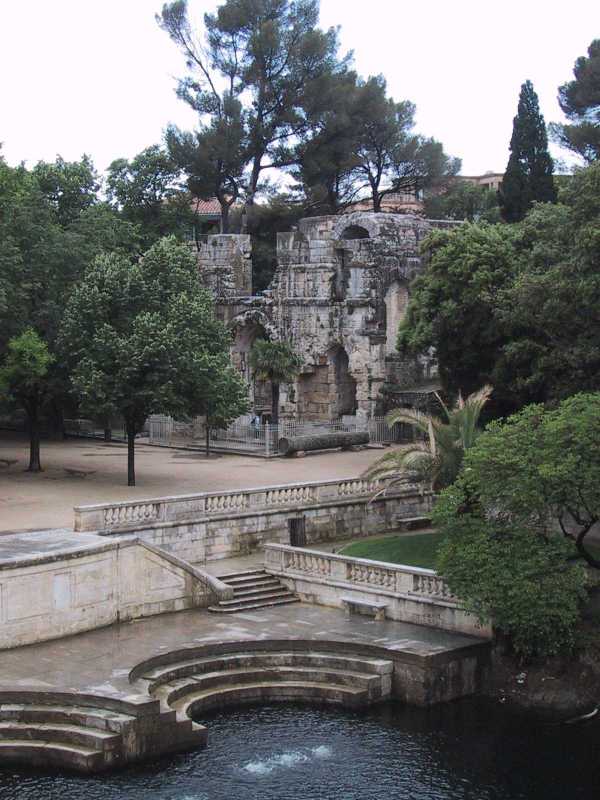 We walked out into a rainy and chilly Nîmes passing the Maison Carrée to a little place where we had inexpensive but good petit dejuner. With packs we walked to the Jardins de la Fontaine. These have elaborate waterways that were unfortunately empty. A large formal statuary area oriented to the south has elegant stairways which lead up a hill with dripping grotto and exotic plantings. We could hear birds but saw none. We mounted the hill to a Roman ruin called the Magne Tower from which we could see the entire surroundings to the east south and west.