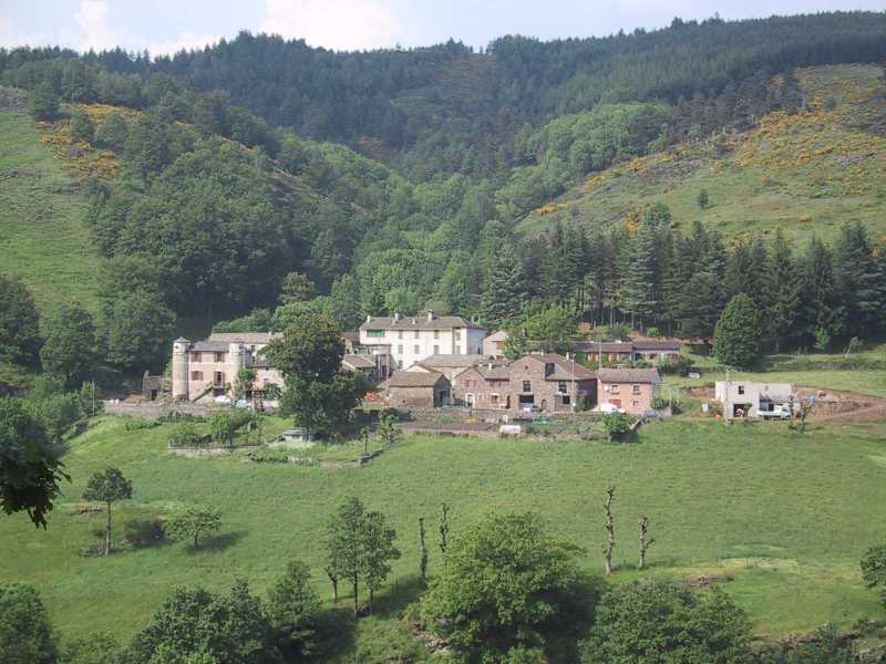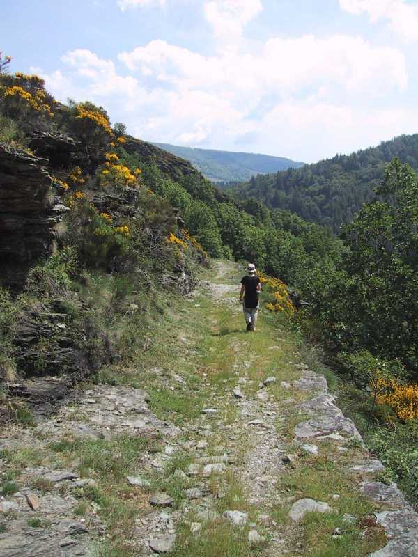 After cleaning up and packing a picnic, we set out for Cassagnas about 10:00 a.m. following two pretty young teenage girls who I suspect were sent out to water the sheep. We left town heading east bearing right on GR 72 which passed through nondescript pine woods for some time. We continued on and got some views but nothing as spectacular as we'd seen in previous days. We passed a formidable Mas with slate roofs and wood piles cut and aging nearby. The trail then descended alongside a rushing stream which joined the Mimente river, passing a bridge over the river and then a beautiful stone building opposite a swimming area (animaux not allowed). We crossed to the gare Cassagnas, which was no longer a train station but had become a restaurant/hotel/gîte with elaborate wooden picnic benches outside. As we were not ready for lunch, we headed up the road to the town of Cassagnas. I picked a little path which I thought would cut off a switchback only to find us hiking directly up a steep slope with briars and thorny trees. However, we hit the main road, and took the old road to Cassagnas. The town was, like Barre-des-Cévennes, built on the south slope of a Can Noire but as it had been bypassed by the new road it appeared to be dieing commercially. We went on through the town and again descended to the main road at the other end of town.