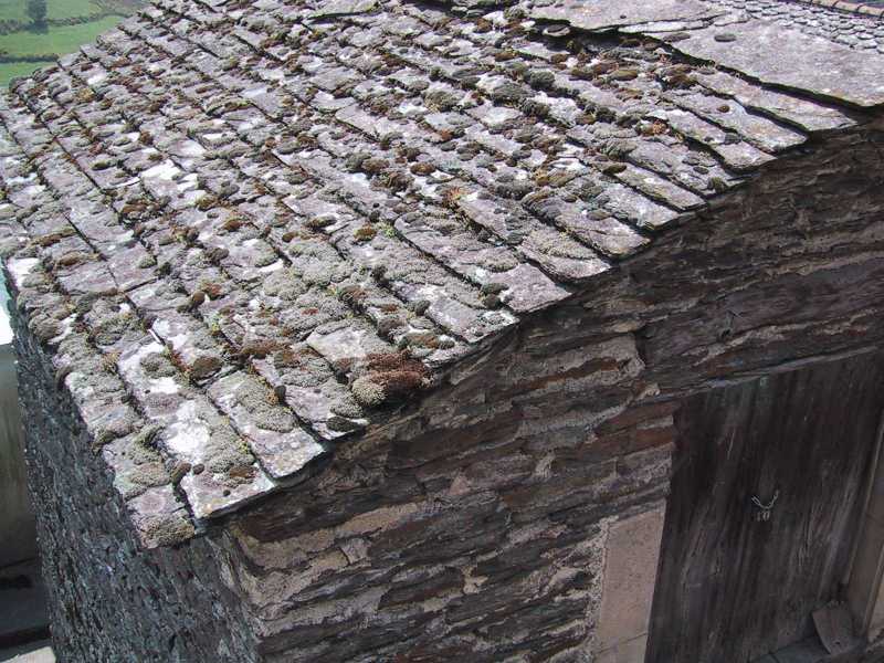 We passed a wire right-of-way that allowed a view of a large stone village but it descended precipitously. Nevertheless, Bon recommended we try it. We climbed and slid down through wet plants and rocks soon reaching a wood road through forest which descended into a pasture and to a stream. Fortunately, we could ford the stream without taking off our shoes as rocks had been placed in the shallows.