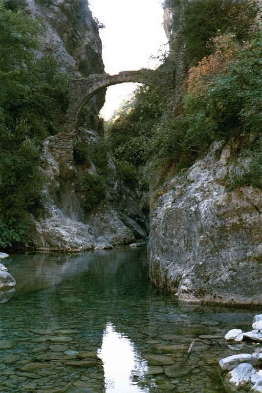 We decided that we would walk to Breil-sur-Roya on a river trail shown on the map and took the road down to the Roya from the church - a road so old you could imagine the crusaders walking on it. But after a short distance we turned south onto another old road which led down to the river path. At the bottom where the trail began there was a sign for les Bains de Semite 350 M. There was a stone bridge with a high arch which had fallen down at one end over the turquoise blue water of the stream. On the rock across the stream was carved "Bains de Semite 1892." Bon suggested a swim and we changed into suits. I jumped in and it was very cold but refreshing.