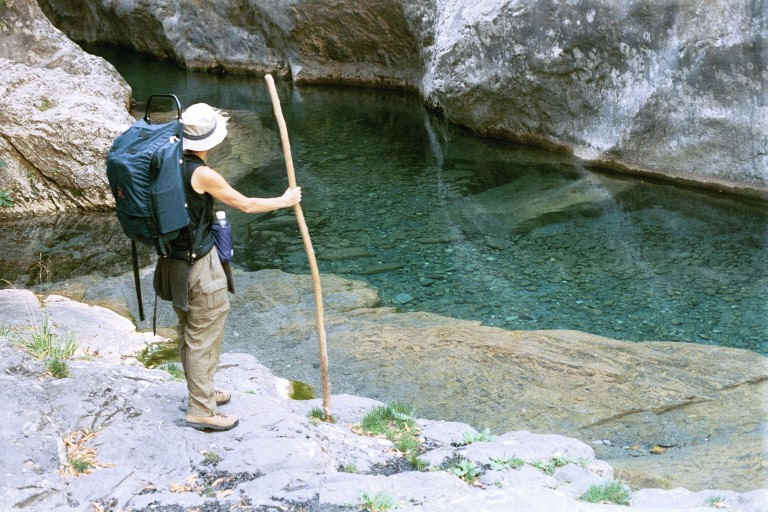 Finally, we reached the last high hurdle and then the trail leveled out near old stone buildings built on olive terraces. There was a beautiful spot in one of the terraces where clear water gushed out and I wet my face with brisk cold water. We descended to a trail along the cliffs across from Breil where the Roya became quite wide, and clear blue. We decided not to cross in favor of seeing the old town. After crossing the Roya, I inquired of two "Mesdames" where the train station (gare) was and they pointed up the river. We marched up on the opposite bank and up a little dirt path to the elaborate station which we had read had been built by Mussolini.