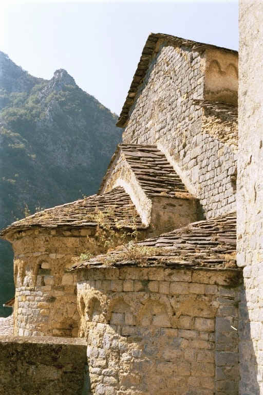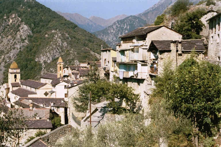 We got up about 6:50 a.m. and went down for the petit dejuner. The Maitre d also had a gas station which was doing a brisk business now that the gas strike had been settled. Madame served us as their cute daughter who was about 12 (she had helped waitress the night before) got ready for school. We left Fontan about 9:00 a.m. walking down the main street which was indeed a busy route, so we crossed a little bridge over the Roya and climbed up to the road we had taken from Saorge the evening before. We entered Saorge and went on to a church which had St. George in a very central location on the ceiling. I wondered if the name Saorge might be a contraction of the Saint's name. There was also the Seeing Eye of God in the triangle as on our one-dollar bill. Went back to the Mairie where I learned that the contraction of the name of St. George to Saorge was correct. I asked an older man who kept appearing about the olive harvest whether the olives needed to be picked or whether they fell to the ground and were gathered. The latter is correct. As the town is built on a cliff, the houses are several stories high and the alleys descend to lower levels. Each of the churches had towers tiled with brown, yellow and green tiles. In the southern part of the town was the oldest church in the Roya Valley; Madone de Poggio, built in 1046. It was beautiful, but locked, though we were able to see a fresco that was being restored on one of the entrances.
