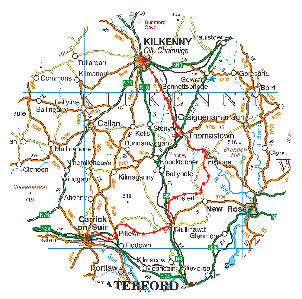 South Leinster Way to Inistioge and bus to Kilkenny (Click on map to enlarge.) |