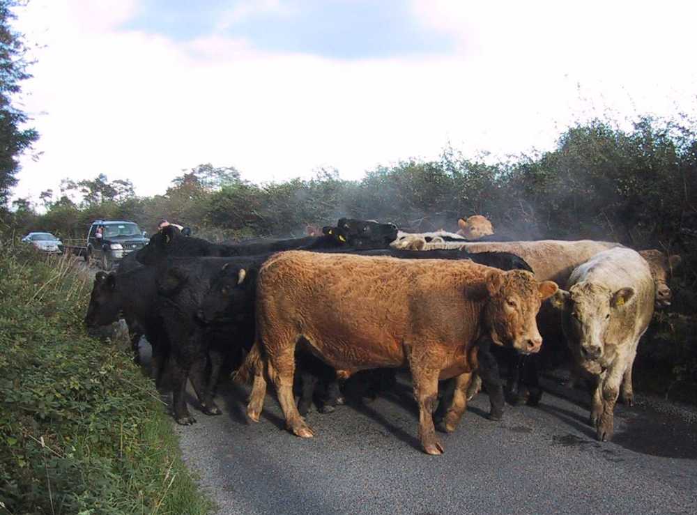The narrow road led gradually uphill through rolling countryside with the silhouettes of mountains in the distance. At one point a car passed us and was stopped by an oncoming car, the oncoming driver recommending that the driver coming our way pull over to accommodate an approaching herd of cattle. I stood with the driver in front of his car as the herd came at us. Huge and steaming, they backed onto each other in fright and I had my doubts about standing my ground. With great reluctance and much prodding by the cowherd (and his canine assistant) the cattle finally trotted by the car. The fellow standing with me explained, "An Irish traffic jam."