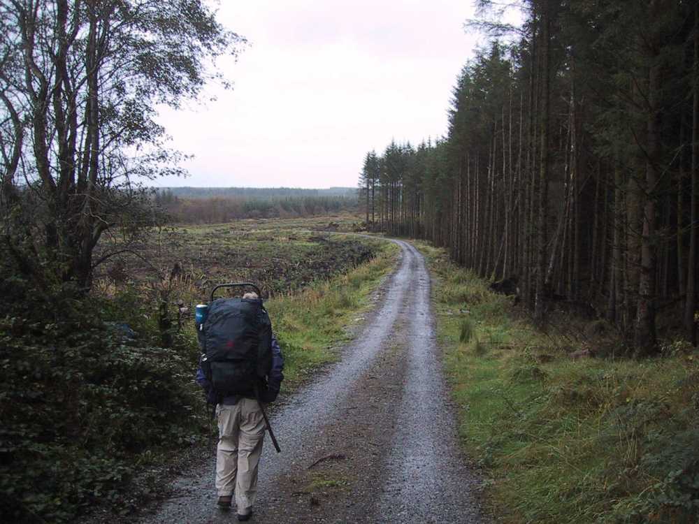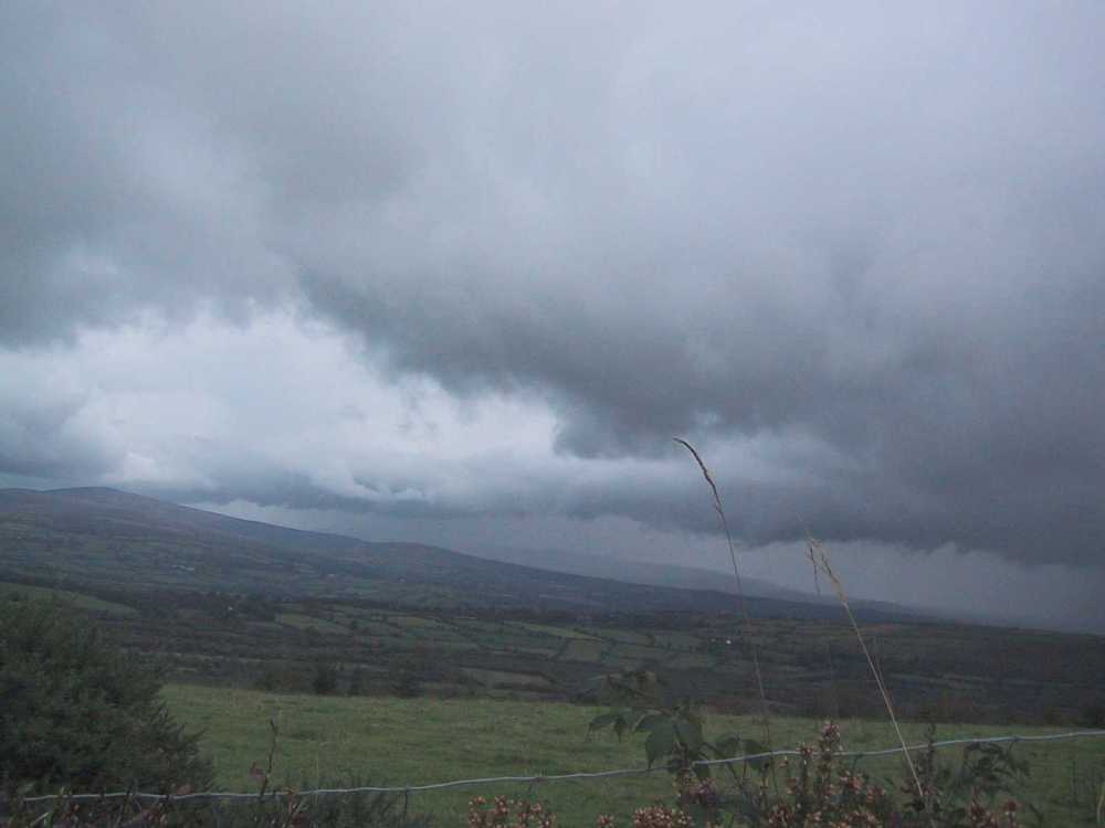 The trail diverged from the road onto a boreen (path) which crossed to another road. This led downhill around a corner and collection of buildings called Glenpipe and to a delightful country road with walls and trees on both sides. The road opened up onto green fields with a hill beyond. We crossed the small Arrigile River and continued up a steep hill to a road. We were now walking between two ridges of hills with neatly tree-lined fields. The clouds were dramatic and we even saw a patch of blue ahead of us. After descending past a farm and going uphill again, we stopped for lunch on a farm road between two pastures of interested sheep. We spread my poncho and used our packs as backrests, eating lunch as the sun peeked out and warmed us a little.