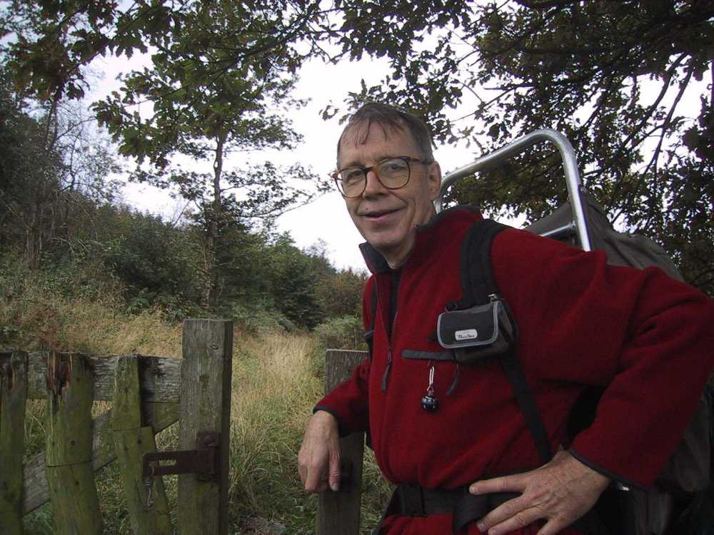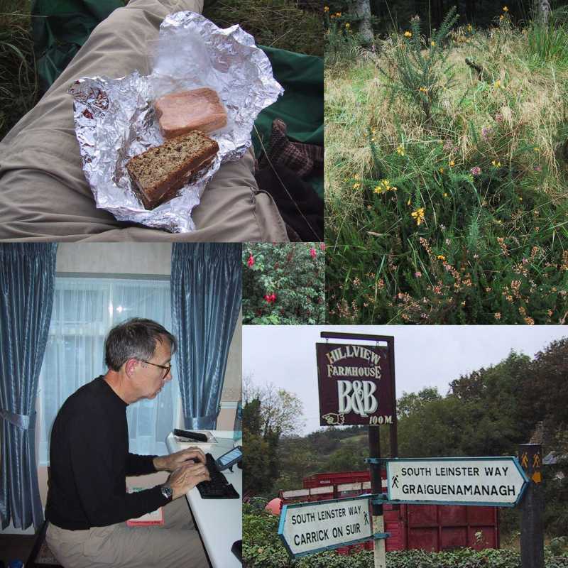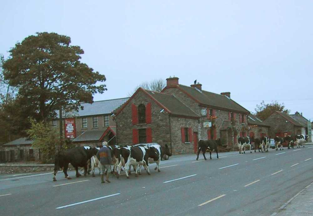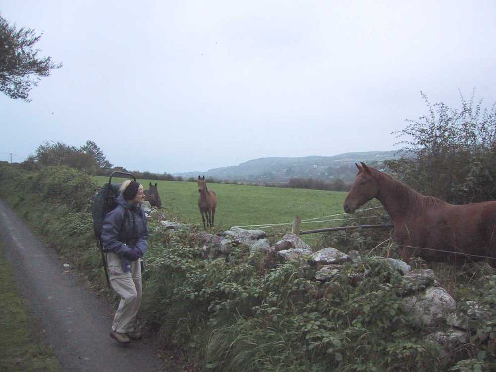 We awoke to a knock on our door at 7:30 a.m. Breakfast was briefly interrupted as cows were being marched down the main street for milking. Our hostess told us that Bon's companion of the previous night was known as The Bishop. (She commented that he was difficult to understand!) She offered to make us sandwiches, and we played with Sasha, a darling five month old Yorkshire Terrier, as she made them. I paid for the room and sandwiches ( 51) and we started off in a light rain and I quickly donned my poncho. We walked east on the main road and through a railroad overpass on the right and on to a narrow country road passing farms with rolling hills in the background. We saw one farmer but mostly were in the company of cows and horses. We did pass one monument to a parish priest that was erected in 1861. We almost missed a right which took us uphill past Crowbally where we chatted with a cowherd whose dog was concerned about us.