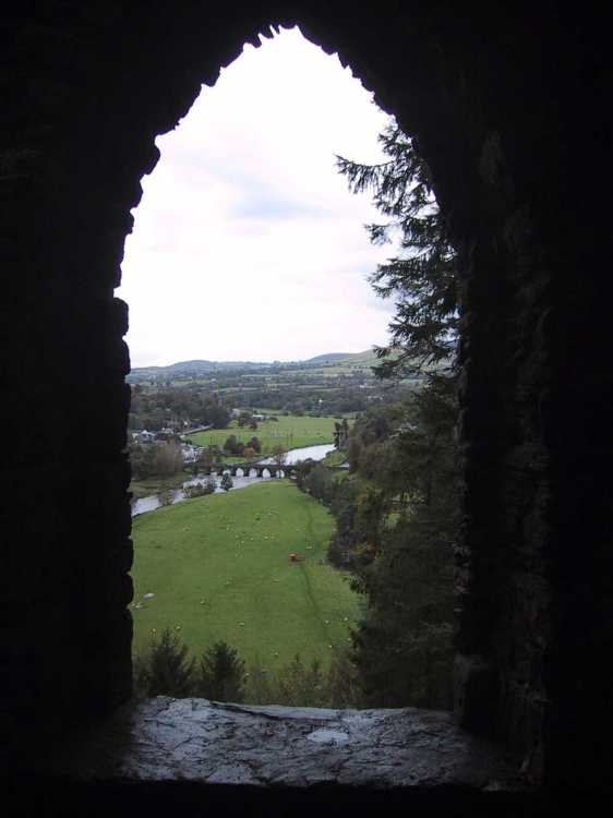 I saw a sign for an lookout point (200 meters) and, though we were tired, we went downhill to see it. The path led to the ruins of a castle-like building built in 1769 overlooking the Nore River (which flows south from Kilkenny) and Inistioge beyond. The view was spectacular and I took several pictures with dramatic clouds in the background.