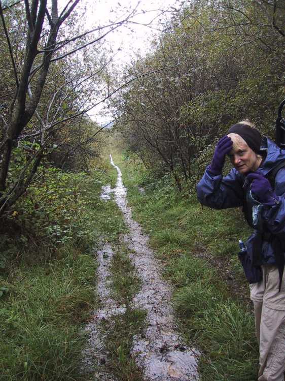 The trail now was occasionally marked but as we descended the marker was confusing. We were unsure of the trail. It began to rain. We walked a long straight trail bordered by thickets which at one point was a puddle from one side to the other giving us little alternative but to dash through it. A little further on, we flushed three large rabbits which Phoebe would have enjoyed. After an interminable spell during which we were still uncertain of the trail, we found a marker pointing up hill into spruce woods.