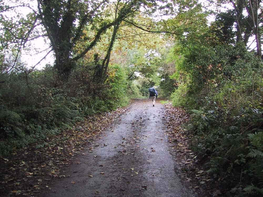 It was now raining steadily. I decided to cut off the mountain trail ahead by a more direct smaller wood road. At first we ended up at a dead end with four abandoned cars, one of which was upside down. We backtracked and took another more overgrown path. However, the entire trail was a stream of water. We tottered on the mounds of grass on the side to keep out of the water. At one point the trail was a full pond and we navigated our packs through some dense piney woods. After a long wet stretch, the path rose uphill to a locked wooden gate leading to a cow pasture. I noticed that there were electric wires which gave us a trail between the two fields of cows and we took off our packs and made it over the gate. Leaving the swamp behind, we marched triumphantly out to the road and turned left on towards Inistioge. The traffic was whizzing by us, so I turned onto a park road through a woods which exited on a small road leading to town.