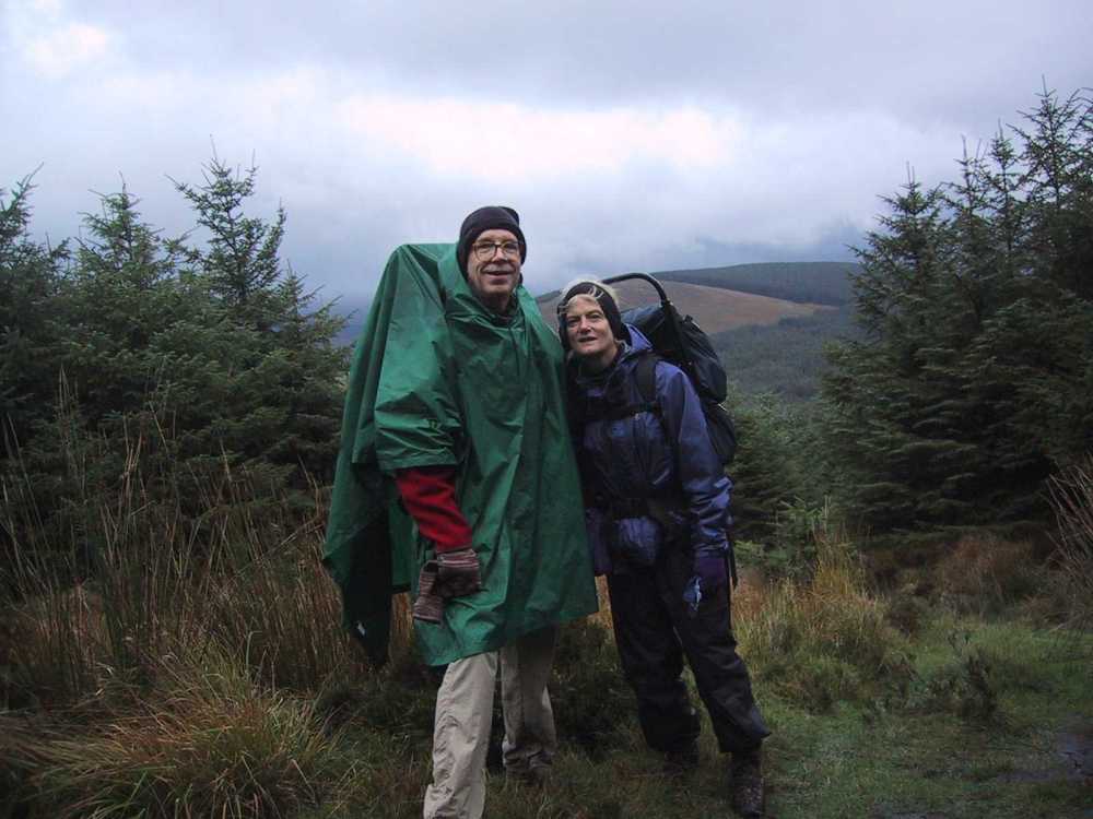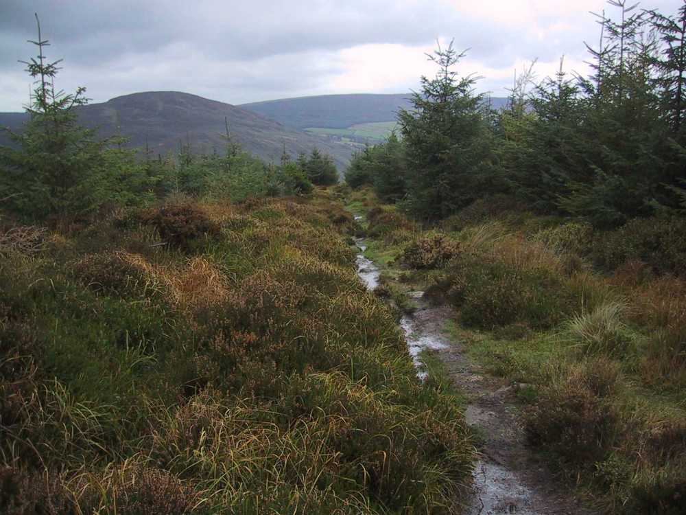 The trail zigzagged a couple of times and just before going up Slieve Maan where we could see it would be wet and windy, we stopped deep in spruce woods for a damp picnic. The trees were full grown and about 6 to 8 feet apart; the ground was soft pine needles and almost no rain came through. We sat on my poncho and ate our bread and cheese. After about half an hour and we were back on the trail by about 2:15 p.m.