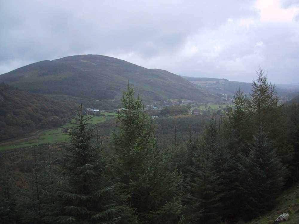After settling with Madge (100) and delivering her grandson to the house next door, we were on our way through hilly countryside to Moyne. We suspected Madge thought we were a little old to carry our packs to Glenmalure since she delivered us a little further along the way where the Wicklow diverged from the road at a stile. Bon and I thanked her warmly and off we went in very cloudy weather starting about 9:50 a.m. Despite weather we could see across the valley and to the hills beyond.