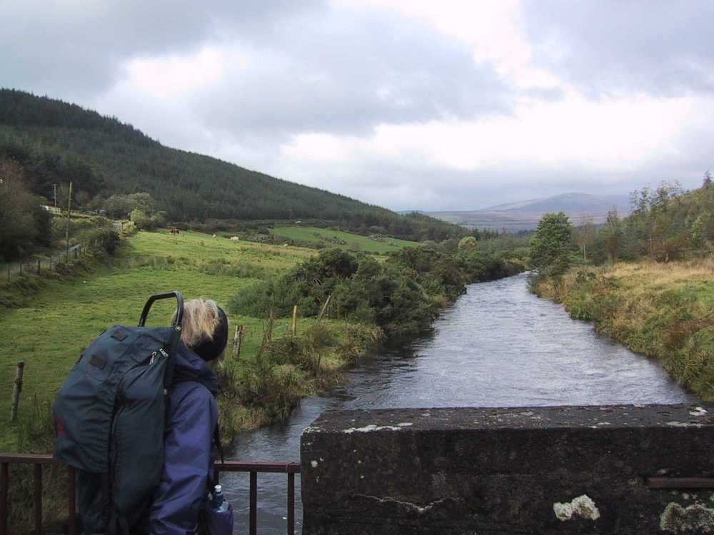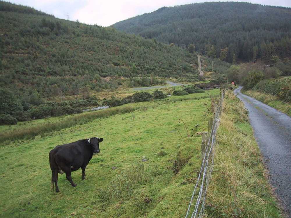 We soon came to a dirt road that zigzagged a couple of times through a newly planted forest of spruce trees which allowed views of the valley. It mounted entering a forest and later descending to an old stone bridge (Ballytiege Bridge). Here we walked on a road next to some sheep and cow pastures, turning sharply to the right to descend to the Iron Bridge spanning the Ow River. There were views of the mountains on both sides of the river valley set off by the green pastures along the river.