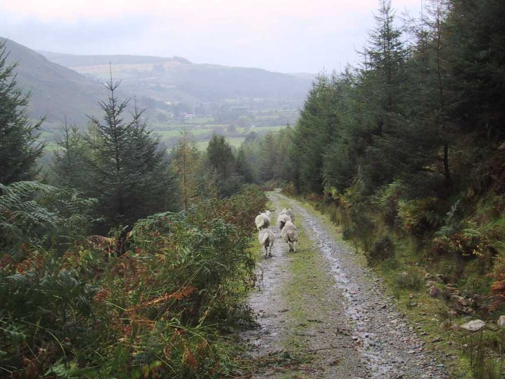 The forests were more like Maine now granite rocks began to appear and moss lined the road. After a long stretch the road turned into a wet boreen, with slippery rocks and tree roots. I was down on my rear end before I knew it, fortunately falling on my pack. The path changed back to a road and we passed through a gate by a roaring stream (Clohernagh Brook). We were now a little tired and zigzagged downhill several long legs to our destination of Glenmalure and the town of Drumgoff. Some sheep welcomed us on the final stretch where they were foraging ferns.