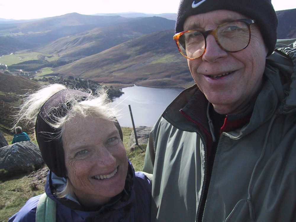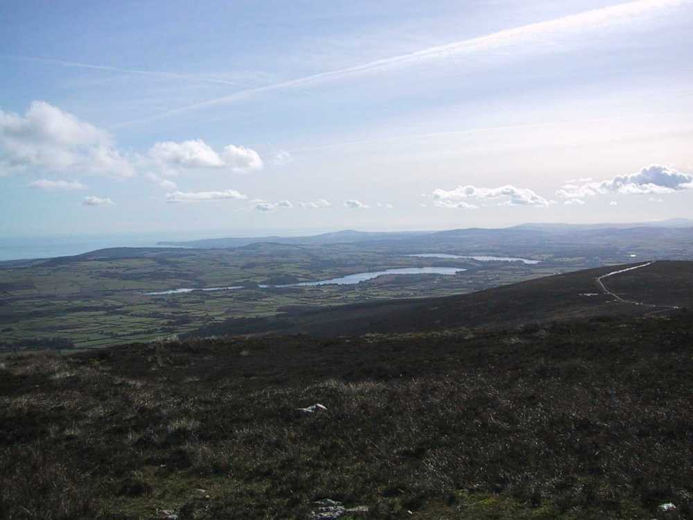 The Wicklow turned right before Djouce but we continued on up Djouce now without the railroad ties, but on a rocky trail with good footing. This last leg took about 25 minutes of uphill climbing. Then it leveled out and we reached the stone and cement cairn at the top. After posing for a picture we relaxed in a sunny and wind-protected spot at a rock nearby, eating a small picnic while admiring the view. I wondered whether we could see the other side of the channel and noticed one spot that looked like land. I asked some other people nearby and one of the men pointed to another location as well where he said a ferry ran between Ireland and Wales.