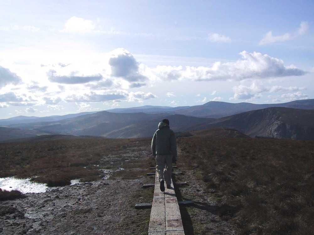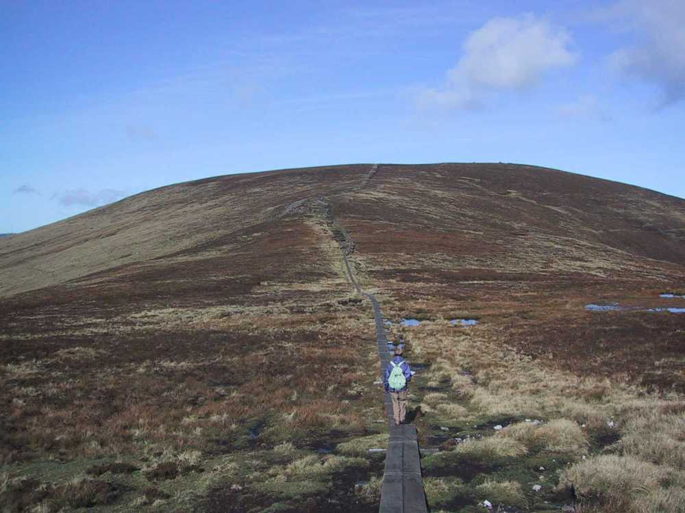 We decided we had enough time to tackle Djouce which required going over one hill and up a substantial climb. As we had seen on Mullacor, the trail was now two railroad ties covered with fine mesh chicken wire, so the going was fairly easy. Without this, however, it would not have been an easy walk as the terrain was boggy for long stretches. I began to tire a little on the uphill. Bon pushed ahead.