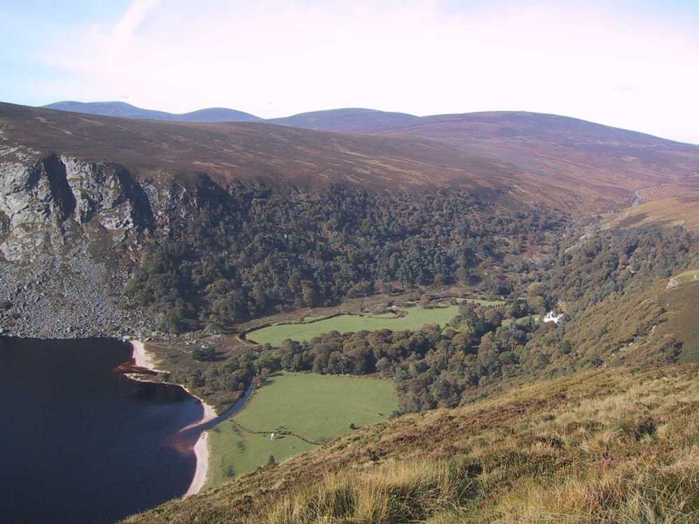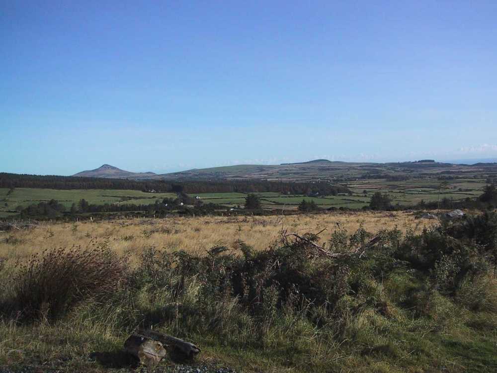 From the B&B we turned right past OConnors grocery, bearing left at the Y off the main road. Unfortunately, this road was more traveled than those we had walked the previous day so we had to watch the traffic. The town quickly gave way to farms and pastures and the road gradually rose giving us a view. At the Sallygap intersection, we continued straight looking for the woods road and anticipating it a little early. Bon found it a narrow country lane bordered by hedgerows which became a park road running gradually uphill. As we reached the forest, we turned to look over a wide expanse of parceled fields. There were two reservoirs in view and in the far distance we could see St. George's Channel, the ocean between Ireland and Wales.