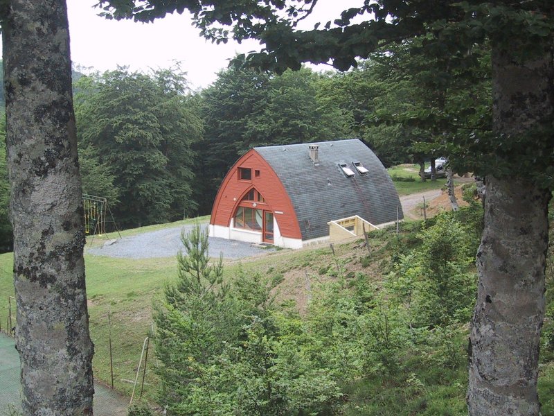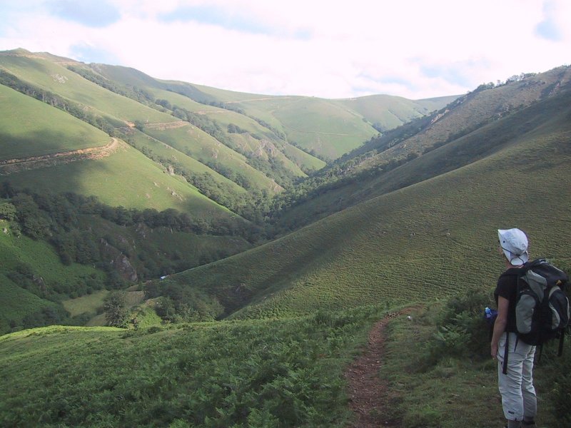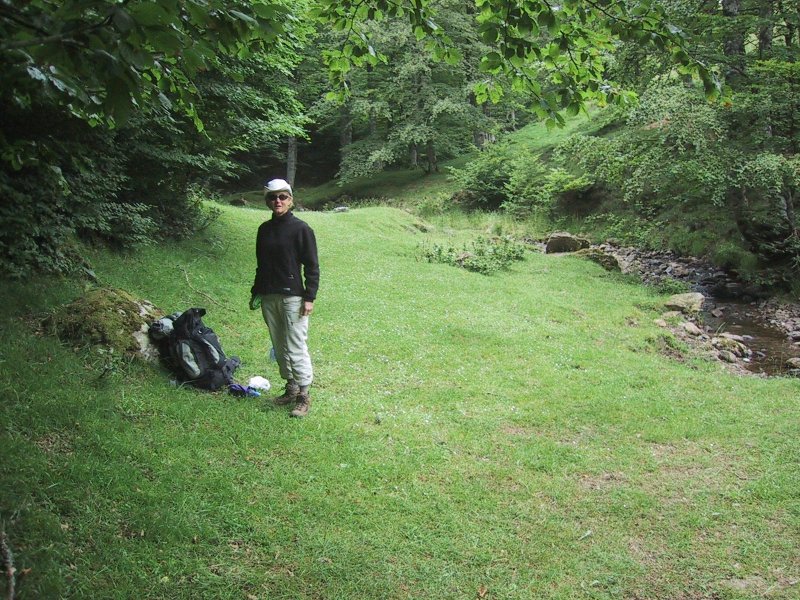 After lunch the trail led through a campground and buildings with a large truck hauling mud from a drained pond. Passing all this activity, we started up some switchbacks and into woods again very steeply. The path then descended through woods and emerged at a road crossing next to a pond with fisherman. It then mounted through woods again and as we climbed we saw Claire beneath us. The trail mounted steeply through woods but at the top came out at some A-frame houses with horses grazing nearby. We crossed a high field down to a ski area. Our gîte, Chalet d'Iraty, was 700 meters up the road and we were fortunate enough to get the last double room.