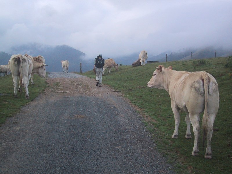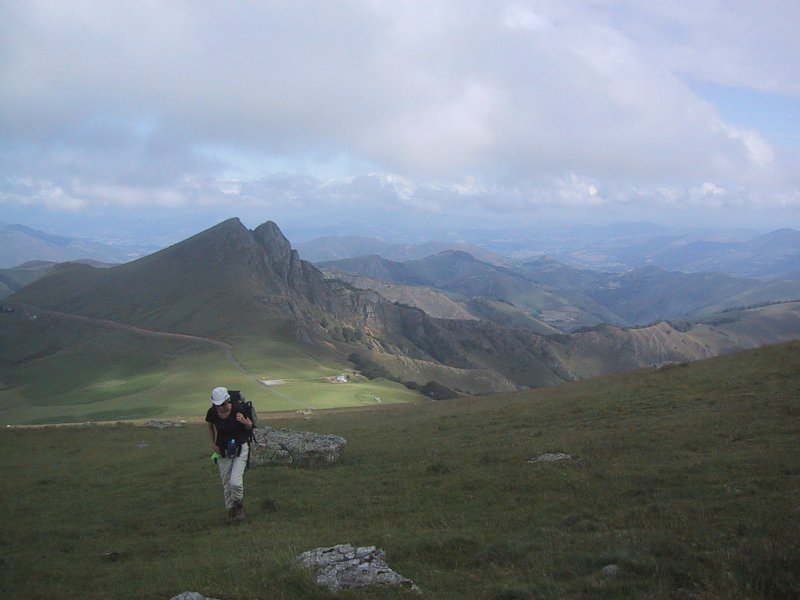 Crossing the col revealed green treeless slopes on all sides. There was a small house where we met our three companions again. They had stopped and were chilled and continued on. We stopped to buy the Brebis cheese and a saucisson - a pepperoni like meat. The shop was filled with rounds of cheese on shelves, saucissons hanging from strings, honey, pate, jam and many other things in a dark room. We headed on along a road passing green fields and a rocky peak on the right. The road led to another steep climb up a field up the Sommet d'Occabe. As we climbed we passed the Frenchman who we had lunched with when we first arrived at the gîte. He had camped out and said it had rained in the evening. He pointed out a circle of rocks which were very old. As we approached the summit we were in the clouds and the visibility lowered. We met four hikers and took each others pictures. We walked on past the summit to a gradual descent with piles of rocks every so often at one of which we stopped briefly. As we were leaving we were passed by George and his father. Bon had forgotten her water bottle so we stopped and dropped our packs as she went back.