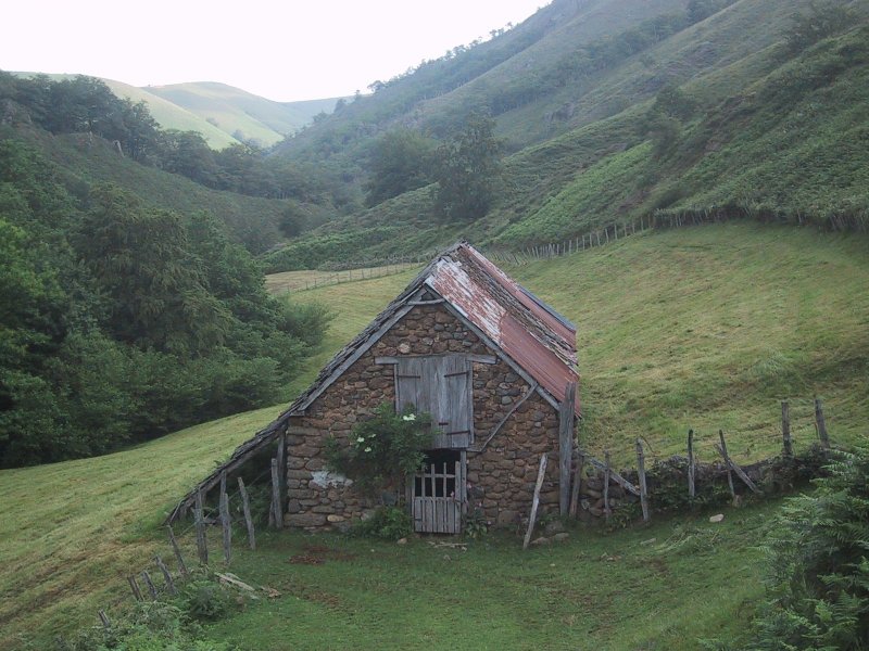 After a communal breakfast of bread and coffee we left Phagalcette at 7:40 a.m. It was a cloudy day with some blue sky to the west. We followed Tom, Jane and Claire, up the road and then (at a small stake in the ground which I would not have not recognized as a trail marker) up a steep hillside bearing to the right toward the top. There the three we were following took a break and we passed a herd of light white-beige cows. There was a view of cloud covered peaks to the east now. We started down a long winding dirt road on the eastern side of Heguieder passing lavender and magenta foxglove and unusual vertical rocks below. At the bottom, the road looped back crossing a rushing stream with a green view of the valley and an old stone building. We diverted to a ruin as our companions passed us again. We could see George and his father coming down the hill.