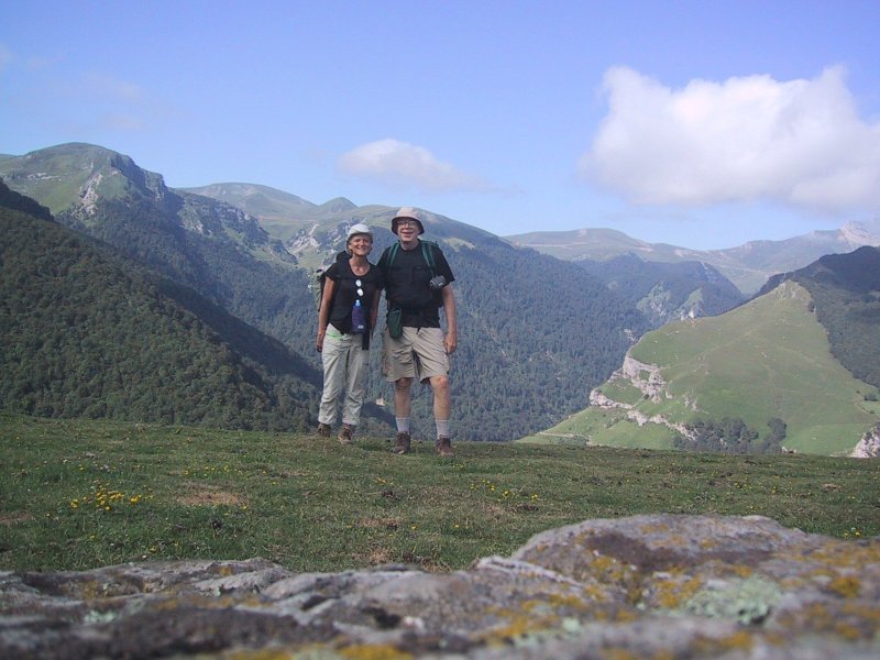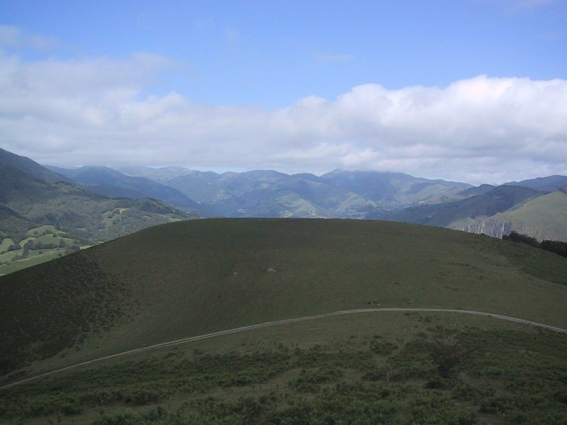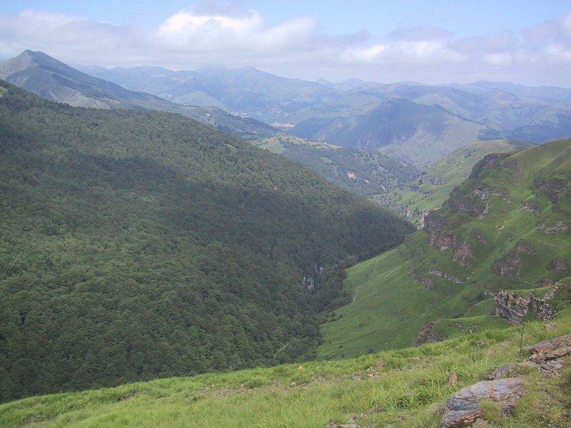 We climbed steeply above Josef looking back at the round hill. At the top it we entered a woods but we lost the trail in spite of a friendly black dog who offered assistance. After some delay, we walked around a lone house at the top and found the trail along a dirt road. This was a gradual climb on a woods road exiting the woods above a farmhouse in a field below and wound around a hill to the left. The road meandered uphill with striking green views down into a gorge and to green hills above. We were overtaken by Josef at this point and he left us in the dust as we admired the views below and the tops of the mountains Otchogorrigagna and Chardekagagna and an occasional view of Pic d'Orhy. This view to the south continued for miles. At a place on the map called Igueloua next to some of farm buildings, the trail left the road and went straight uphill. Josef had stopped for lunch, but we decided we wanted the climb behind us before eating. Again we lost the trail where it entered the woods even though we'd seen a pole above - we wasted too much time looking for it. It climbed steeply up a grassy hill to the Col dAnhaou.
