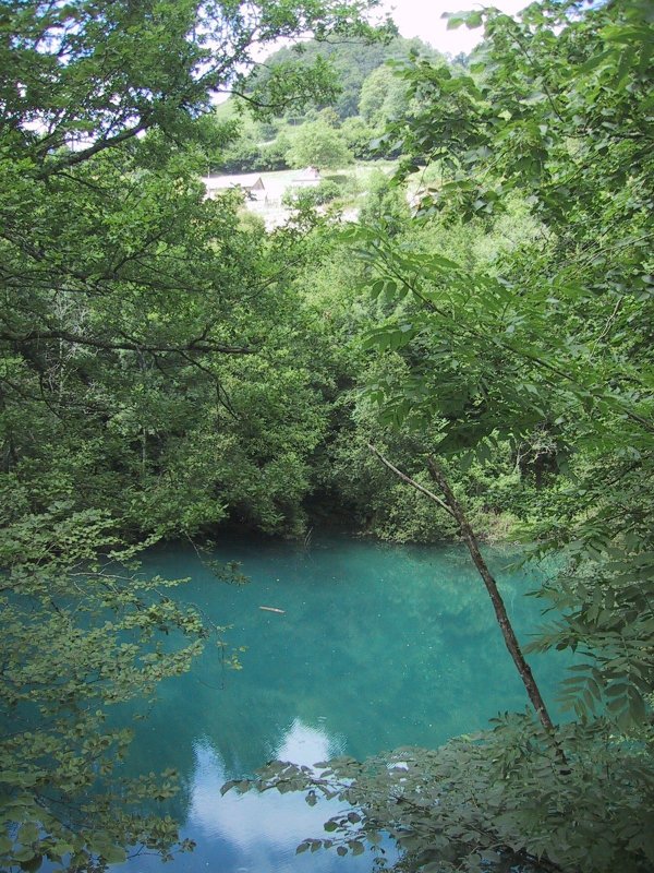 The muddy dirt path crossed another road and then a stream but continued on down and down until it came out at the Port d'Enfer. This bridge crossed a river flowing into a large azure pond - a darker blue than the sky. There a steep cement road joined a busy main road which was crowded with people parking their cars to swim and congregating around an ice cream snack bar.