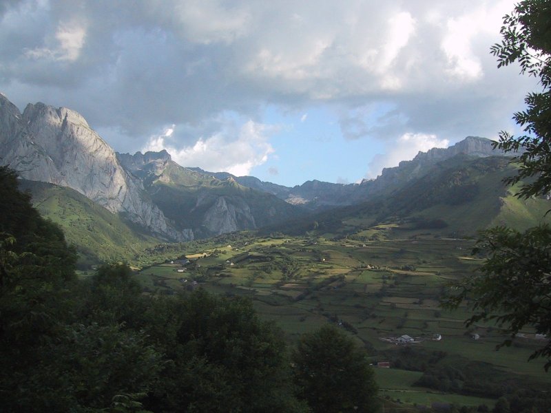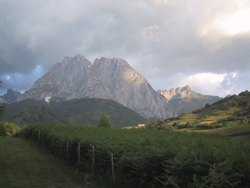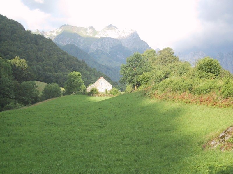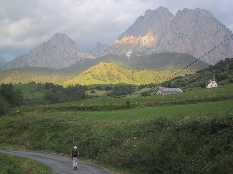 After Bon "brewed" coffee using the hot water in the sink, we were off at 7:04 a.m. The trail led out of the southern part of town with dramatic views of storms and sun on the peaks beyond. It was windy and the clouds were scudding northwards. There was blue sky with the moon above and dark clouds to the south while the sun began to glare over the mountains to the east. We hiked down a road and crossed a bridge taking a sharp upwards path past a campground. It mounted in fields which were brilliantly lit by the sun and then passed through woods to the northwest. As we came out of the woods we passed into the valley of Lhers descending with a hill rising on our right and beech trees and the valley beyond on the left. The beeches had lost a lot of their nuts in the strong wind. The trail descended to the road and followed it crossing a wide stream and then rising and turning left past a couple of buildings where three dogs greeted us. (One was a Great Pyrénées of which we had seen many.) Passing the farm the trail rose through pasture to the right and after climbing a bit we stopped for some bread and cheese. We could see Tom and Jane (sans Claire) coming up the road to the stream. They waved and came up below us as we got started.