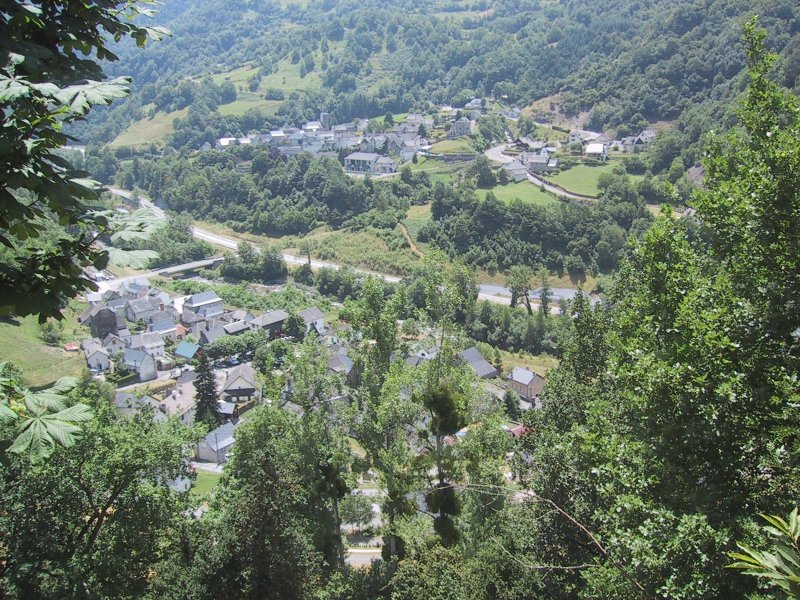 George and Alan showed us the short cut to Etsaut and we descended across a stream by a wooden bridge and then over the road by a more substantial footbridge. We walked south to the bridge across the river and north into Etsaut where we booked a room in the Hotel des Pyrénées (with blinking neon sign). We unpacked our food and walked up through the town following signs to a view point. There wasn't a good picnic site until I opened a gate in a fence on the terraced field of a private house. We had a nice picnic over the town. But we were tired from the steep up and down.