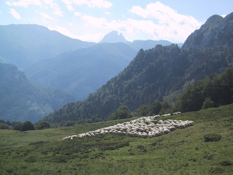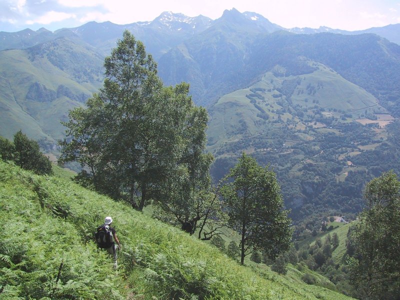The trail continued to mount steeply for a long time now through woods. It left the road but remained a steep and tiring climb through woods until we reached Col de Barrancq. Here we dropped our packs and hiked up the alternative trail to get the view to the east which was spectacular with field descending and sheer rock cliffs on the right with mountains with snow to the east including Pic du Midi d'Ossau which had a distinguishing double peak. We sat and ate some raisins admiring the view but were quickly discovered by a horde of flies.