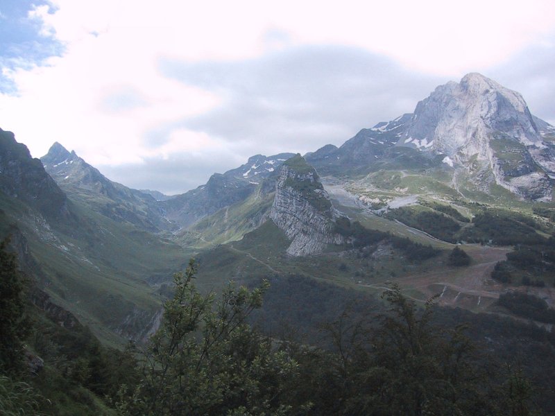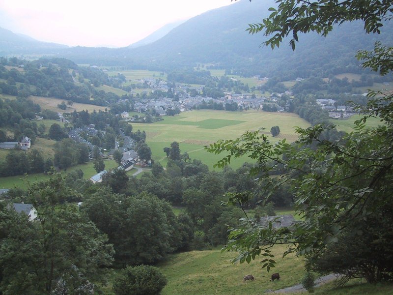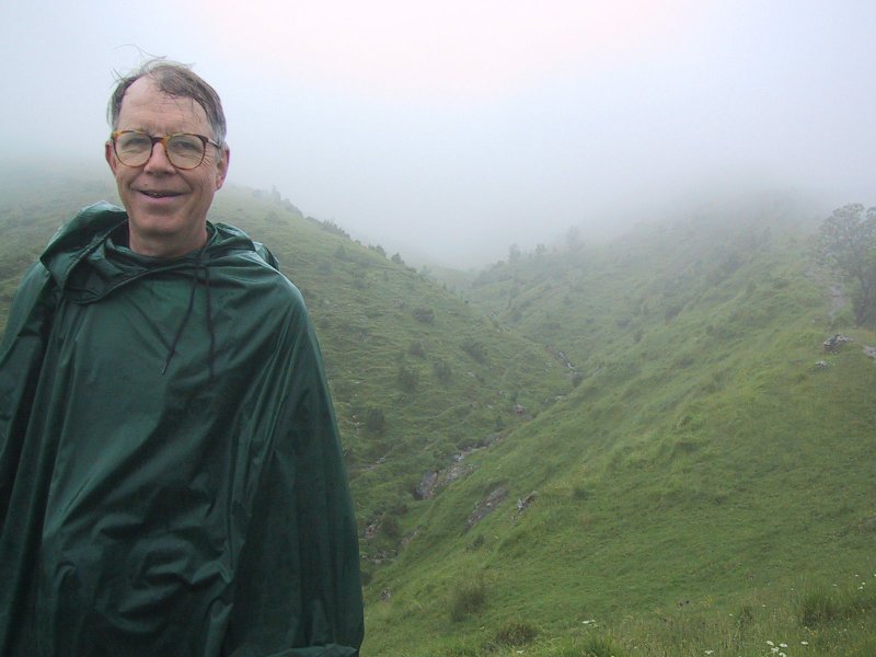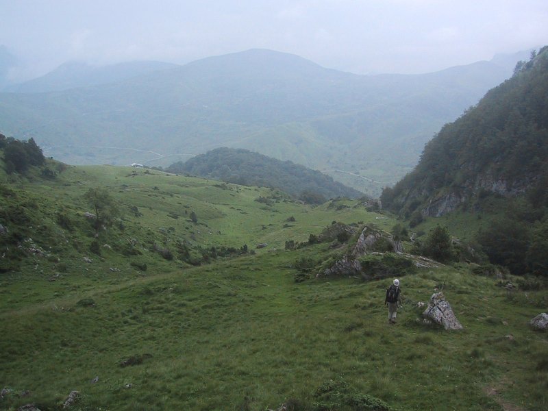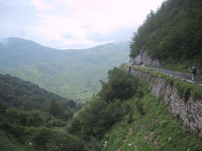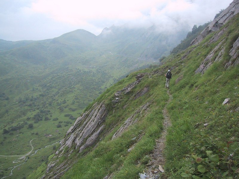 We walked back up to the tennis courts and picked up the trail passing lots of children who were embarking on various hikes. The trail snaked steeply to the Col de Tortes where a couple of vertical rocks were visible in the fog. At the col it descended and we could see (and hear) a flock of sheep being herded up a green slope. There was one ambiguous crossroad where I walked one way and Bon another until she found a marker. Then we continued down grassy slopes with a few unusual yellow rocks in the trail. Finally the trail descended to a road which we took to the right. It was a pleasant road around the Pic de la Latte de Bazen built on the side of a cliff and about 150 feet above the base of the cliff allowing views of the valley and the hills topped with clouds across the valley. The trail went to the outside of a tunnel where it was very narrow and a precarious path one step to the left and you would be on your way down. We navigated this successfully and the next (and shorter) tunnel included the trail. After this second tunnel the drizzle was such that I decided to don my poncho to keep the upper part of my bag dry. As the trail completed its circuit around half the mountain, it came out to a high pasture with the valley, a river and a road below. This was the dividing line between Pyrénées Atlantiques and the Haute Pyrénées. In the past, this road had been one of the critical climbs in the Tour de France.